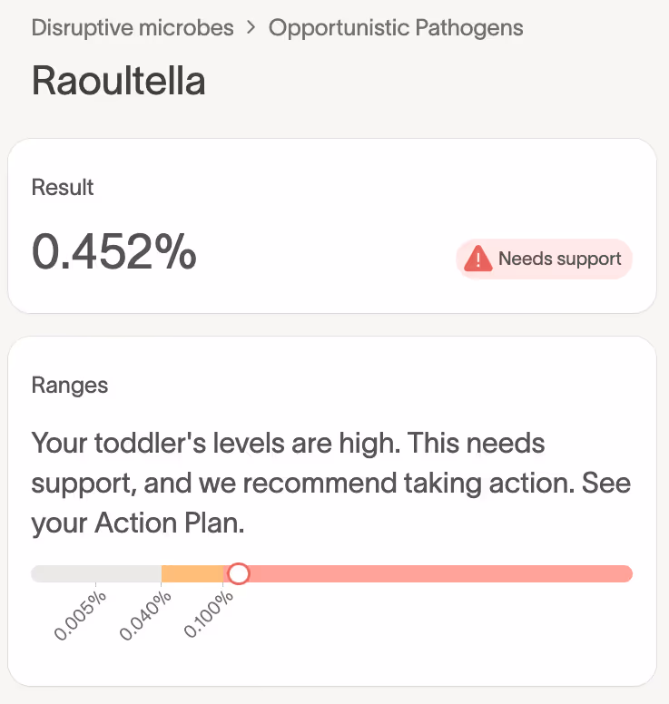 From a Raoultella level of 0.452% down to 0% in just six months, this is a great example of how resilient our little one's gut is when given the right support.