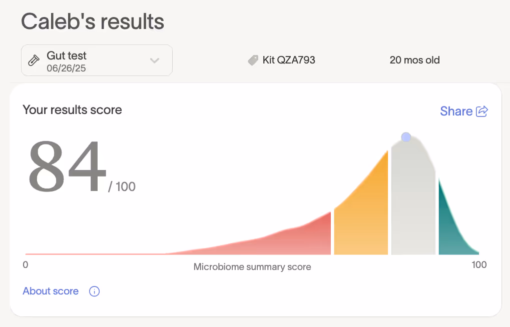 “A Tiny Health post came across my Instagram. I had read that eczema can be a gut problem, so I ordered the kit. I mailed it off the day after Christmas in 2024. He was 14 months old at the time and still waking up crying and screaming every 3-4 hours.”