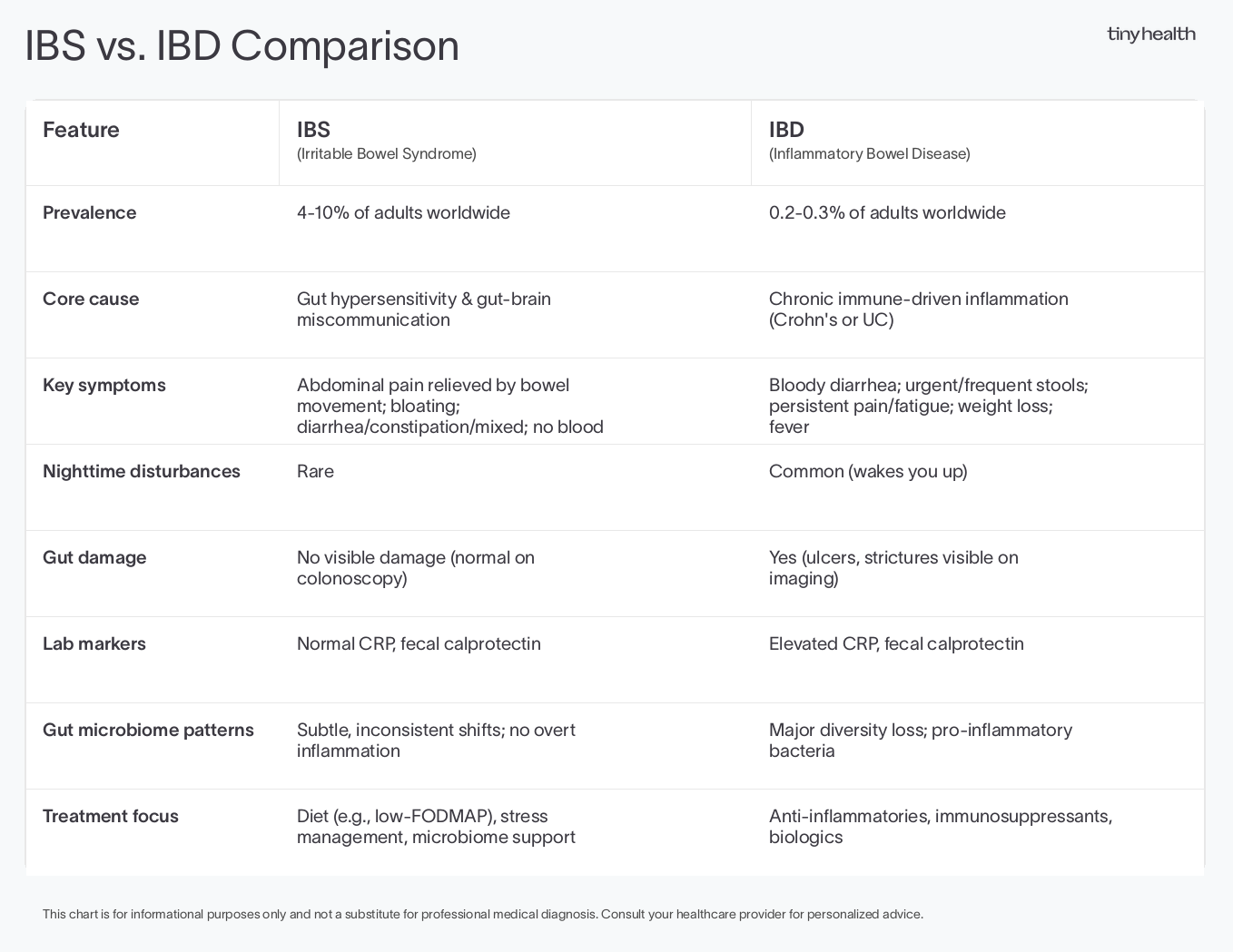 IBS and IBD share symptoms like stomach pain and bloating, but they have different causes. IBS stems from gut-brain miscommunication, while IBD involves chronic immune-driven inflammation that can damage the digestive tract. Learn the distinct symptoms of each condition, how gut bacteria affect them differently, and get a side-by-side comparison chart to quickly spot what makes them unique.